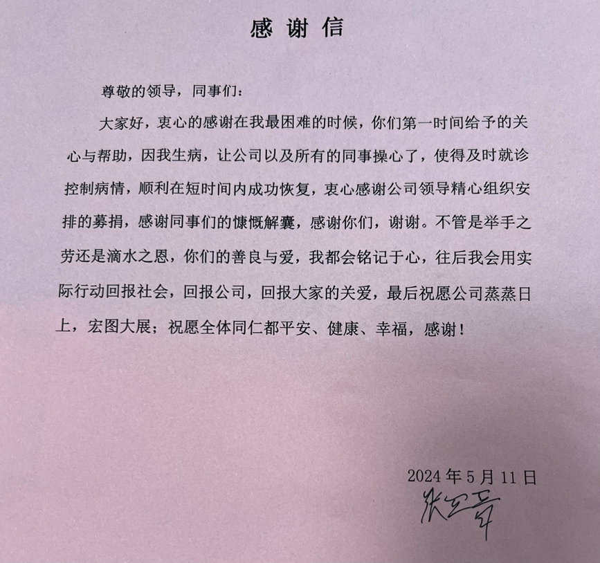 ‘Zhang Sijin was unable to work due to his physical illness, and the expensive medical expenses had already left little of his family's savings from years of hard work, while the ensuing treatment costs added to the already impoverished family. After learning the news, the company leaders initiated an internal donation activity.